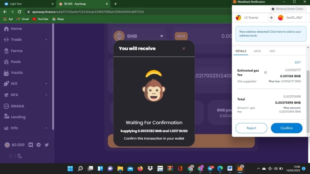 Click on supply to confirm the amount of BNB/BUSD added -> Confirm